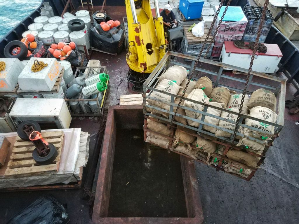 On most remote islands like Aratika, subsistance comes mainly from fishing and copra industries. Copra is the dried kernel of coconut used to make oil. It took 6 hours to unload the supplies carried by the boat and load the fish and copra shipments to be sold in Papeete. It was quite late when we left, and time for a good sleep. Night was surprisingly good, and we woke up just before arriving to our second stop in Arutua.