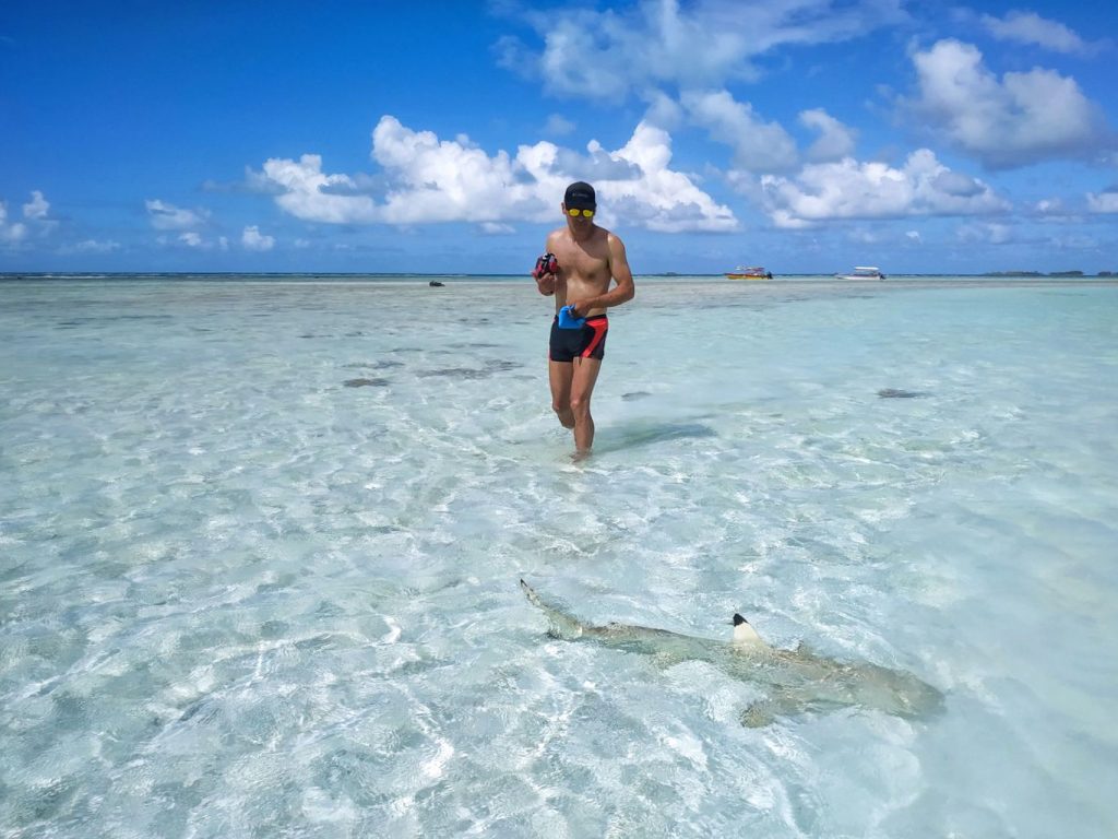C’est un petit lagon niché au coeur du lagon, un endroit de toute beauté baigné par les eaux turquoises de Rangiroa et bordé de petits motus au sable blanc et parfois rose. On fait un premier arrêt à une toute petite encablure de notre motu pour nager au milieu des requins pointes noires et citrons. Tout le monde sur le bateau n’est pas forcément excité par l’expérience mais Vee et moi sommes déjà équipés de nos palmes, masque et tuba avant que le bateau ne s’arrête. Il y a quelque chose qui nous fascine chez les requins. On n’est pas déçu car on se retrouve vite entouré d’une quinzaine de pointes noires avec qui on passe un bon moment. Les requins citrons sont plus distants et restent par 10 ou 12 mètres de fond. Le bateau ancré, on débarque sur notre motu pour y passer l’après-midi. Le peu de fond nous oblige à finir à pied au milieu des jeunes pointes noires qui font à peine 50 centimètres de long. Pendant que notre capitaine et hôtesse préparent le repas, Heio notre guide et entertainer pour la journée nous emmène explorer les motus voisins. On croise un bout de terre où nichent les sternes blanches et noires. Un peu plus tard, Heio nous fait une démonstration de tissage à partir de feuilles de palme. Tout y passe, panier, chapeau et dessous de plat. On admire sa dextérité et Vee hérite d’un joli chapeau pour les jours à venir.