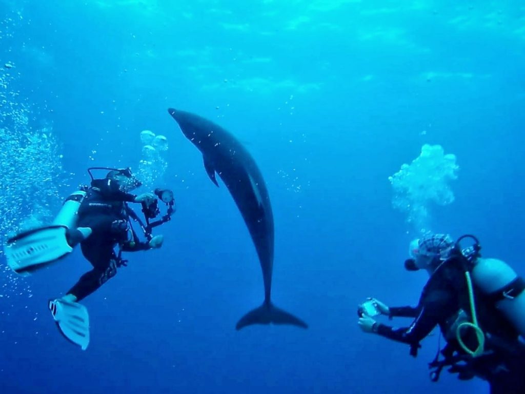 Lorsque le courant sort de la passe, les requins restent en profondeur et ne sont visibles que de loin. Ils remontent à des profondeurs accessibles quand le courant rentre. L’idée c’est donc de pouvoir alterner les types de plongée pour profiter de tout ce que la passe à offrir. L’alternance des courants est globalement rythmée par les marées mais ça serait trop simple. Le niveau de remplissage du lagon, la houle et le vent joue aussi leurs cartes. La nature ne joue pas en notre faveur cette semaine et on n’aura pas de courant rentrant de tout notre séjour. On se contentera de quelques requins gris et autres pointes blanches de lagon mais de loin seulement. Restent les dauphins qu’on apercevra de plus ou moins près à presque toutes nos plongées, la maman et son petit remportant la palme de l’instant mignon à chaque apparition.