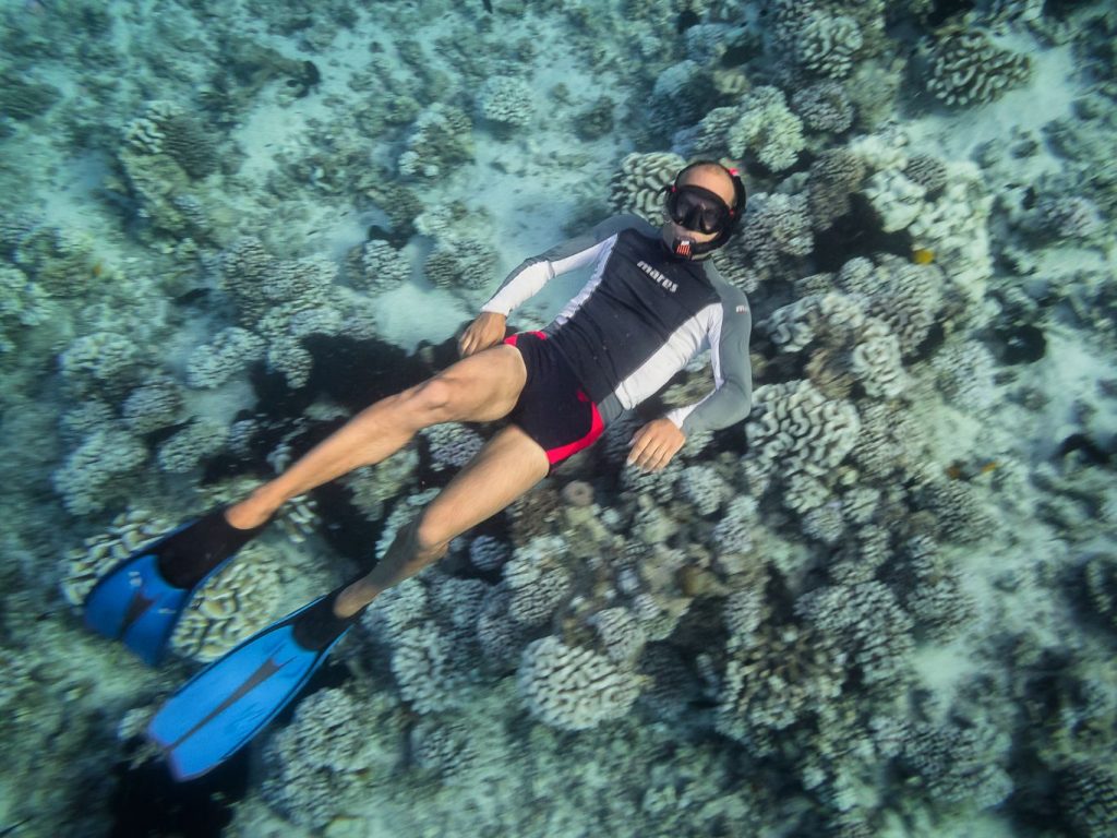 On met les pieds au centre de plongée de bonne heure lundi matin pour un refresher. Comme notre dernière plongée remonte à plus de 6 mois, il faut faire un petit cours de rappel dans pas trop d’eau on ne sait jamais. Vu qu’on est certifié PADI (organisme américain) on sent comme un petit dédain de la part des guides de palanquées tous certifiés CMAS (fédération française), et c’est la première fois qu’en moins de deux minutes la conversation tourne très technique, très chiante. C’est limite si on doute du fait que notre masque qu’on a acheté et avec lequel on plonge depuis plus de 6 ans est adapté à notre visage. Equipés comme il faut on saute dans le bateau avec Denis notre guide et instructeur pour le cours de rappel. Posés à 4 mètres de fond, nous voilà repartis pour les exercices de base à savoir retirer et remettre son détendeur, vider son masque et ainsi de suite. On enchaîne par une plongée d’une heure dans le lagon abrités du courant de la passe par un petit motu. On y croisera un bon groupe de requins à pointes noires. En termes de variété et de couleur, les coraux ne sont pas plus impressionnants que ça. Notre refresher en poche, on rentre déjeuner à notre pension avant de plonger à nouveau en fin d’après-midi quand le soleil se couche.