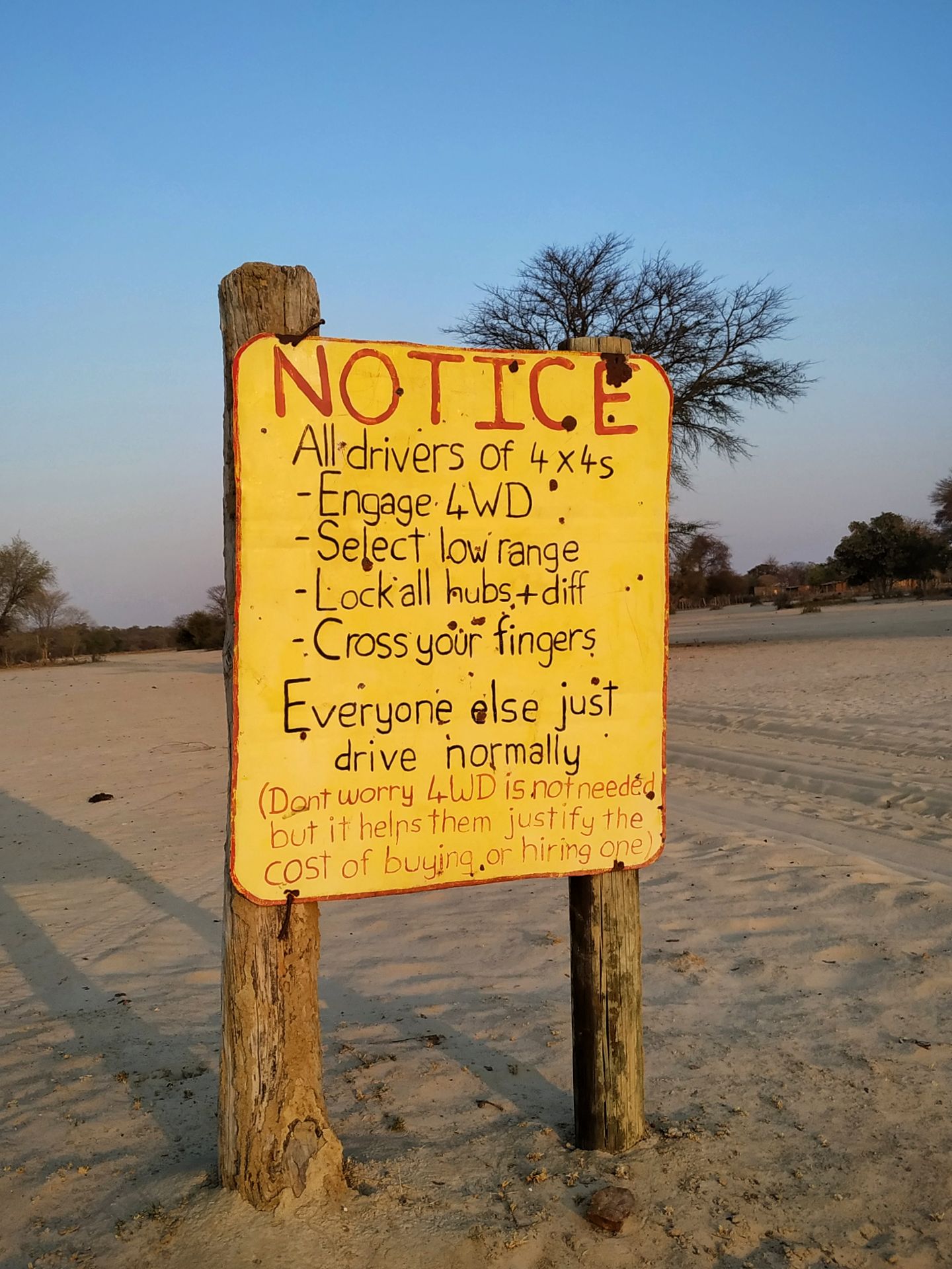 The Caprivi strip is a long stretch of land located on the North East part of Namibia. It is bordered by Botswana to the South and by Angola and Zambia to the North. We drove all day to get to Divundu on the Western side of the strip. This part of the country is surprisingly populated. There are many villages along the road, each with a small number of huts and fenced areas for cattle. This plus very good road conditions, it was already a big change compared to Botswana. The only downside was the cows’ discipline level… If they were very careful in Botswana, they really behaved like queens of the road in Namibia and were crossing anywhere and anytime, completely oblivious of the traffic. We stopped couple of times to stretch our legs and take some pictures of road signs to complete our collection, and we arrived at destination at the end of the afternoon.