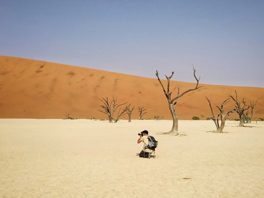 Deadvlei is located approximately one kilometre from the 4WD car park. It was still early but the heat was rising up very fast and the flat walk in the sand was not that easy. Our efforts have been rewarded when all of a sudden we had a full view of this massive surreal land, where red sand dunes contrast with the white clay surface, the dead dark trees stuck in time and the crisp blue sky. Despite the crowd, there is an incredible feeling of remoteness and loneliness, as with a bit of patience, you can easily disconnect yourself from the rest of the world to become part of this amazing place and let yourself drawn into your surroundings.
